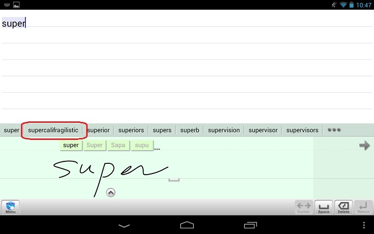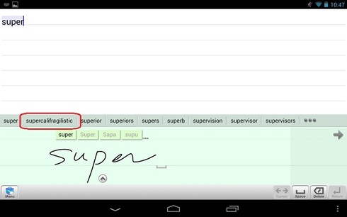 Getting correct recognition for long words seems to be rather difficult. At some point, a mis-stroke (at least from my poor hand) will cause the prediction to go astray and trash correct recognition at the beginning of the word, and editing only confuses the matter. A workaround of course is to commit the word in chunks, but doing so adds spaces. Deleting them interrupts the flow of writing.