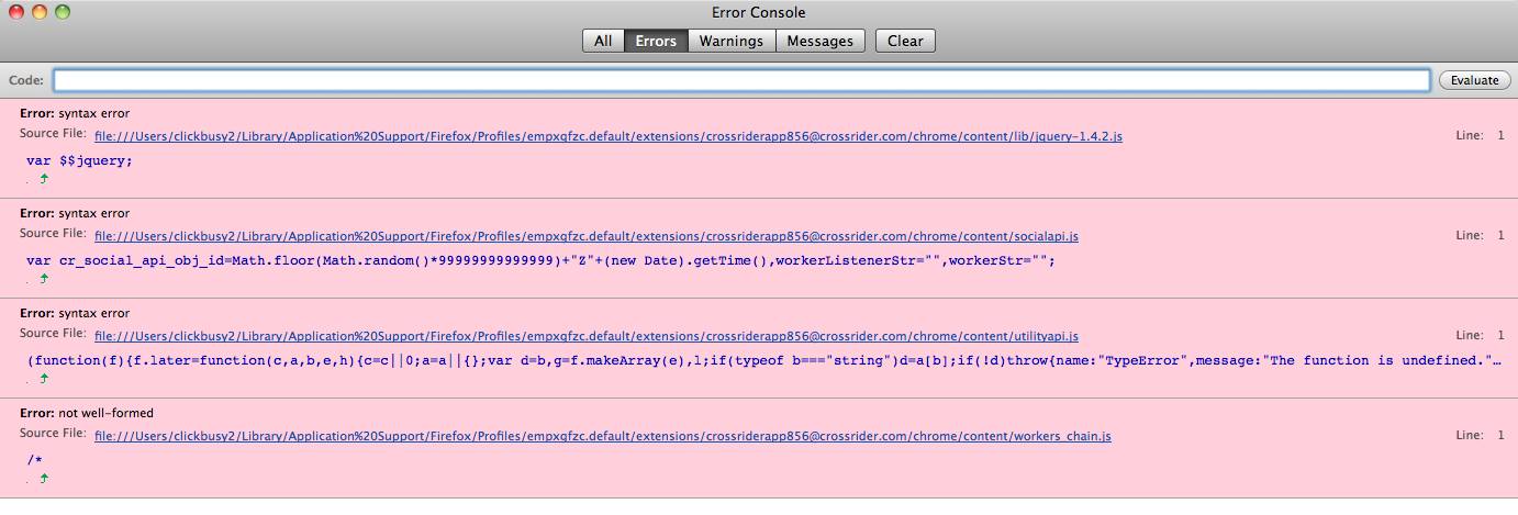 Firefox throws errors on jquery-1.4.2.js, socialapi.js, utilityapi.js and workers_chain.js on sample applications and even empty projects.