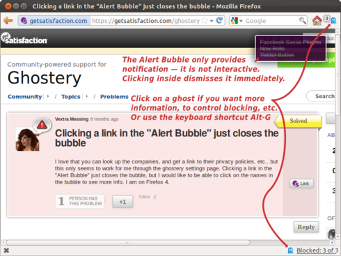 I love that you can look up the companies, and get a link to their privacy policies, etc.. but this only seems to work for me through the ghostery settings page. Clicking a link in the "Alert Bubble" just closes the bubble, but I would like to be able to click on the names in the bubble to see more info. I am on Firefox 4.