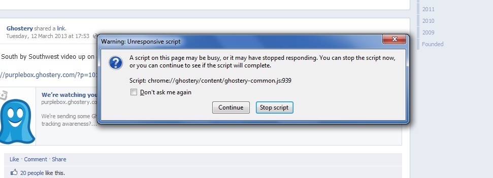 I have a problem with facebook freezing lately, I have disabled click-to-play options as recommended with no change. This is the notification that pops up. Script: file:///C:/Users/Eric/AppData/Roaming/Mozilla/Firefox/Profiles/9yus0g1m.default/extensions/firefox@ghostery.com/components/ghostery-content-policy.js:66 It then asks me to stop script or continue, all the while the page stays frozen or severely lagging.