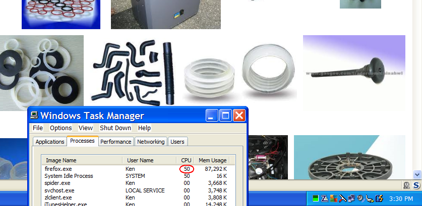 When I then begin to scroll and browse through the images, within a few seconds Firefox's cpu usage percentage jumps to 50% or more, and thereafter will not decrease below 50%. No matter how long I wait the cpu use remains locked at 50%. I must exit Firefox completely to get the cpu usage to drop back down and the cpu to cool off.