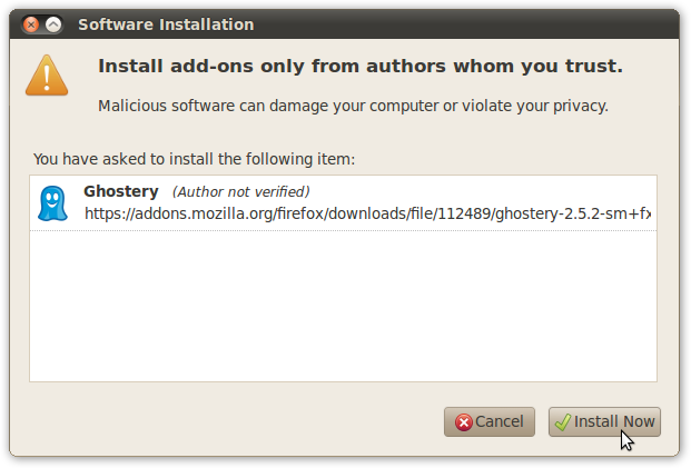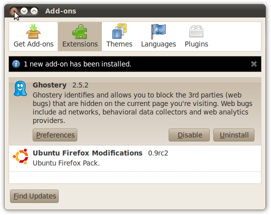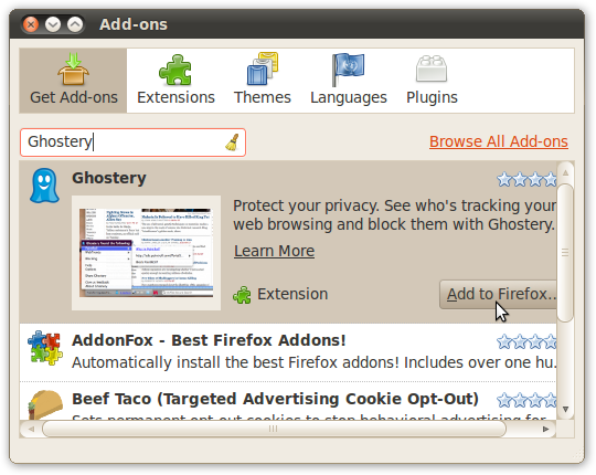 These screen shots demonstrate Ghostery installation using Firefox 3.6.x on Ubuntu 10.04 LTS. Things may look a little different on other platforms, but they should work the same way.