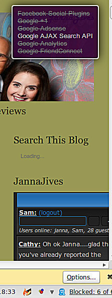 Ghostery says it is blocking "Google AJAX Search API" but it shows up in white letters (as if not blocking).