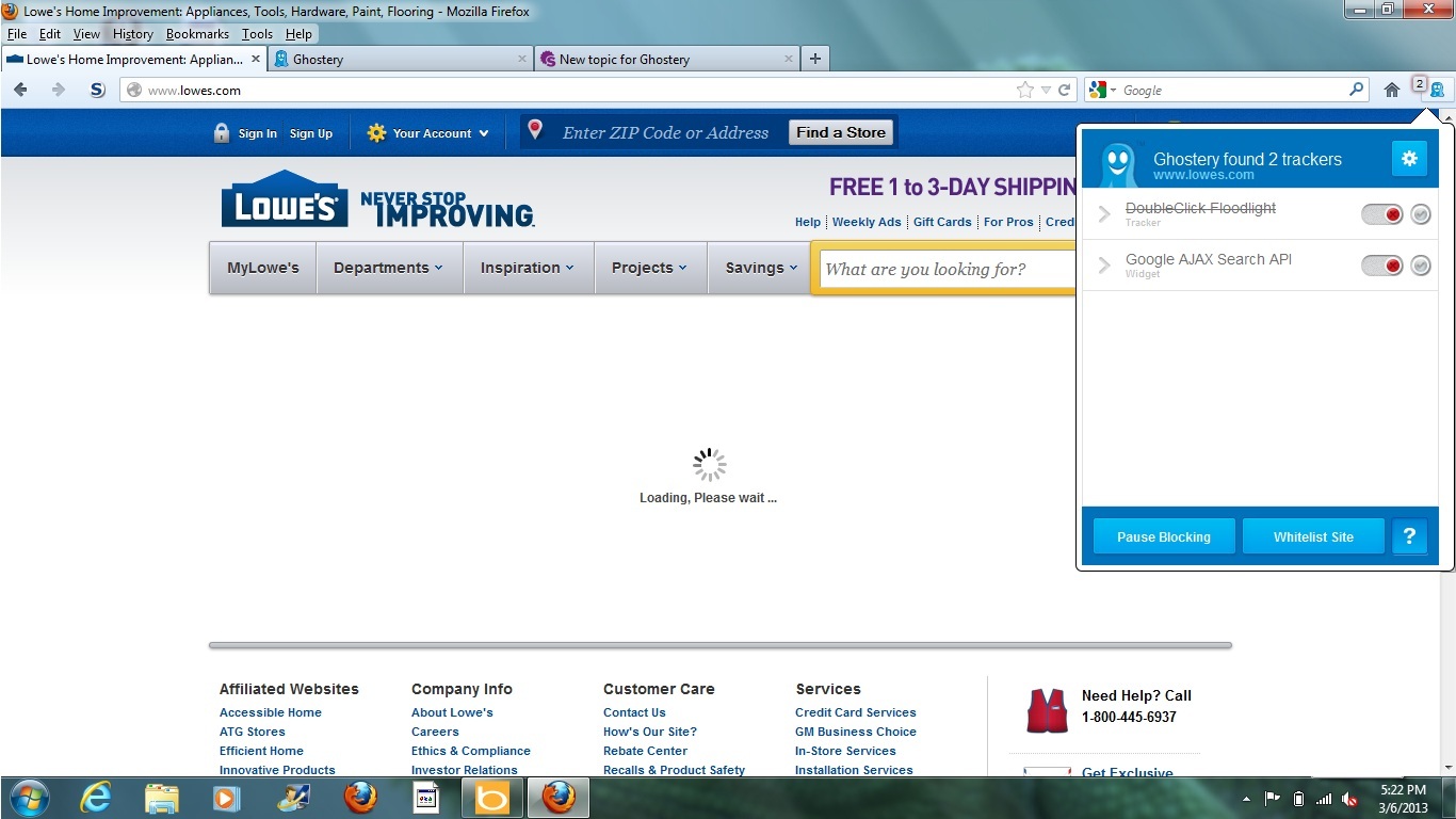 There is a tracker on www.lowes.com (google ajax search api) the red Xis lit and the check mark is there, but it doesn't show it's blocked.