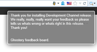 I like Ghostery 2.8.1, which I'm using with FireFox 14.0.1, but I'm really starting to get annoyed with the feedback message box that appears on the top right corner of practically every new web page: "Thank you for installing Development Channel release. We really, really, really want your feedback so please tell us whats wrong or whats right in this