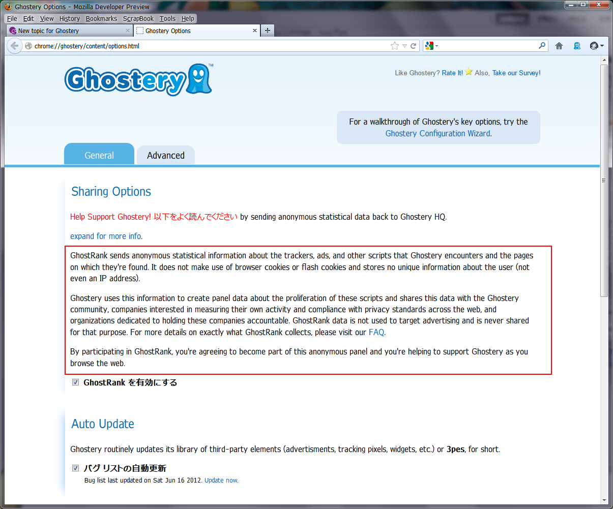 さらに詳しくGhostRankがどのような情報を収集するかについて知りたければ、FAQ(http://www.ghostery.com/faq)をお読みください。